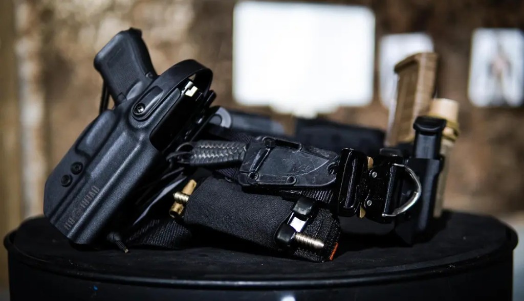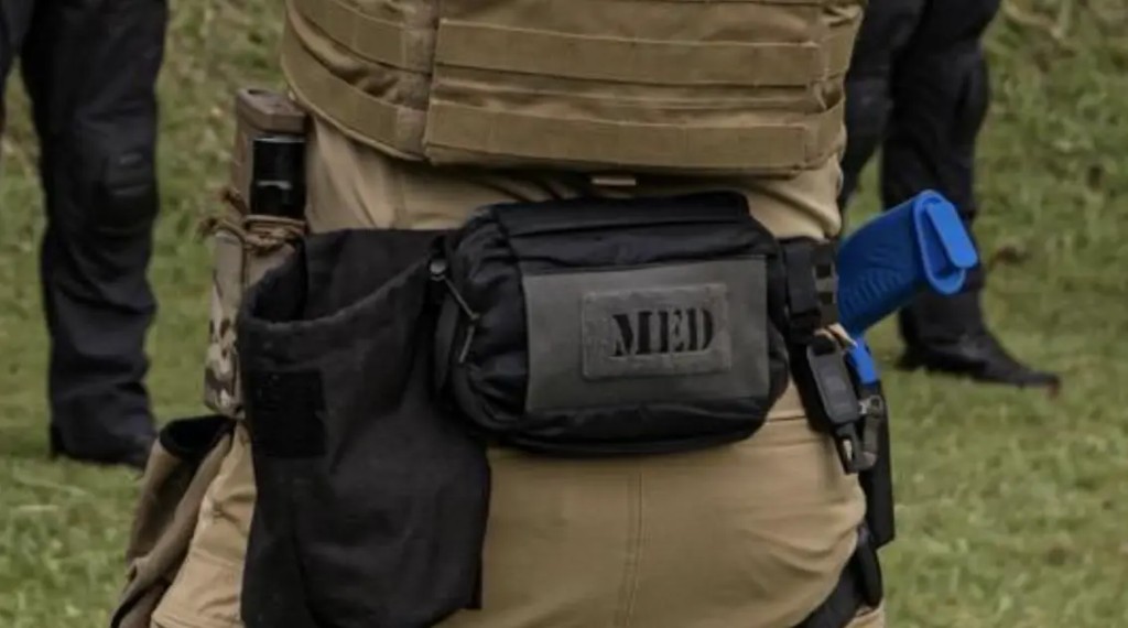 Complementos possíveis: torniquete horizontal à frente do coldre e, se necessário, uma faca de combate organizada de modo a não comprometer o saque da arma nem a extração do torniquete.